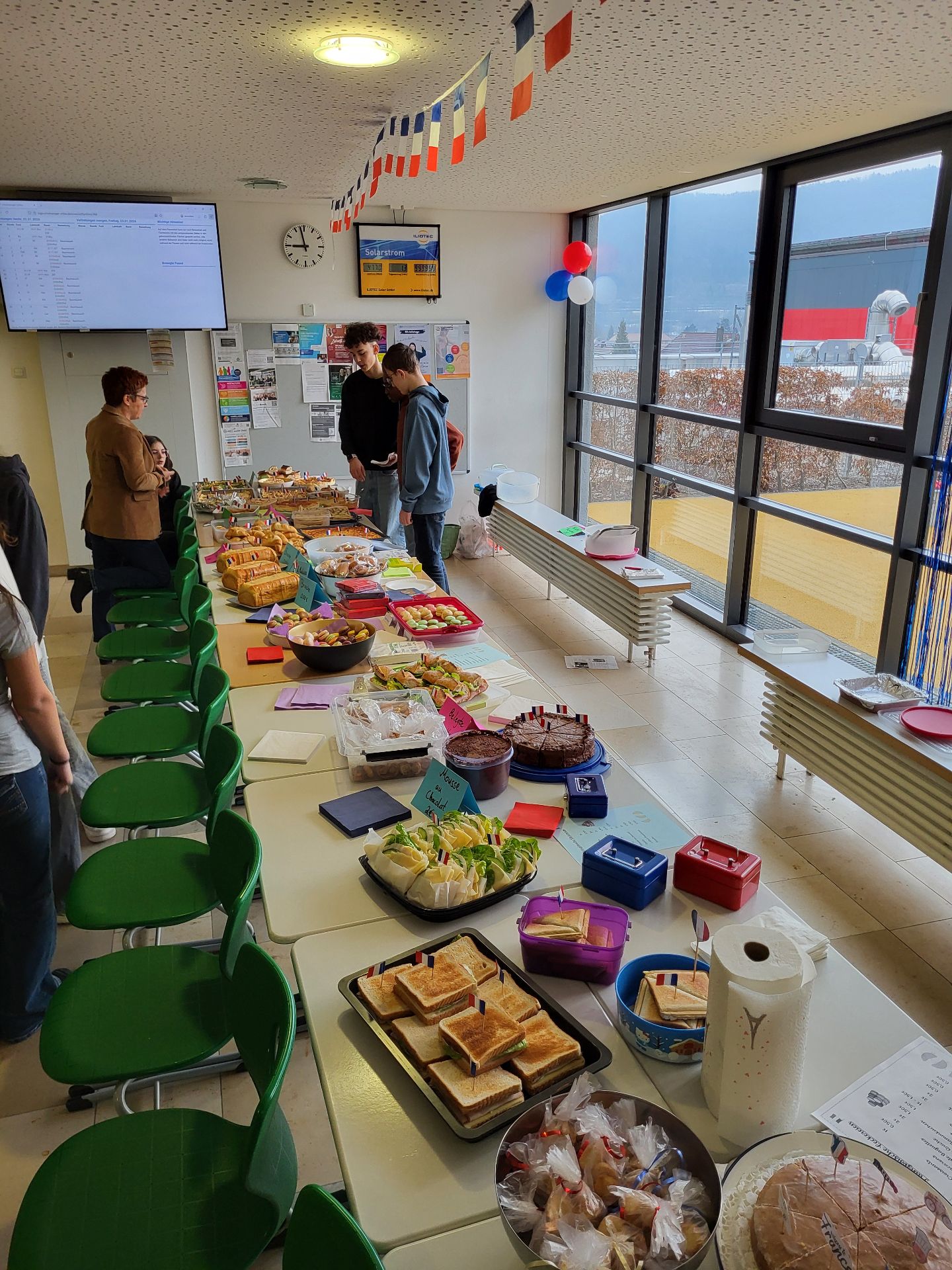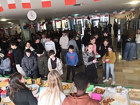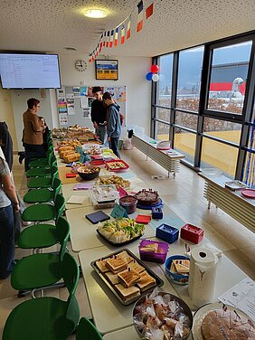 Am deutsch-französischen Tag selbst übernahmen alle vier Französischklassen gemeinsam mit ihren beiden Lehrkräften Frau Lisson und Frau Sauer den Pausenverkauf. Während der ersten Pause und der Klassleiterstunde konnten die Schüler und Lehrkräfte verschiedenste französische Köstlichkeiten probieren. Hierfür haben alle Französischschüler gemeinsam ein abwechslungsreiches Buffet auf die Beine gestellt – es gab Quiches, belegte Baguettes und Crêpes, diverse Kuchen und Macarons, selbst gebackene Sablés und viele weitere französische Leckereien.