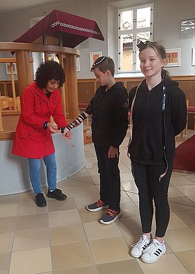 Daher war es für die Schüler möglich, sakrale Gegenstände genauer unter die Lupe zu nehmen. So konnten manche in die Rolle jüdischer Gläubiger schlüpfen und die entsprechende Gebetskleidung anlegen. Dazu gehören z. B. die Tefillin, ein Lederriemen mit dem wichtigsten jüdischen Gebet in einer Kapsel. Und wer es seiner Lunge zutraute, konnte versuchen, einem Schofar-Horn, einem Widderhorn für sakrale Zwecke, einen Ton zu entlocken. Auch eine Thora-Rolle, welche für den gottesdienstlichen Gebrauch nicht mehr zugelassen ist, konnte von den Schülern bestaunt werden.