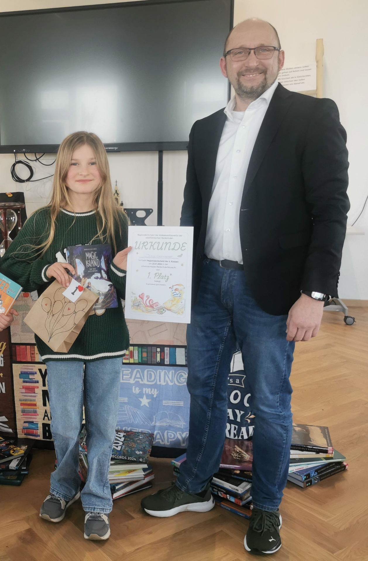 Für unsere Schule traten die beiden Schulsiegerinnen Julia Schoeller (Klasse 5c) und Hannah Helldörfer (Klasse 5d) an. In der ersten Runde präsentierten alle Teilnehmenden einen vorbereiteten Text aus einem selbst gewählten Buch. In der zweiten Runde mussten die Schülerinnen und Schüler ihr Talent beim Vorlesen eines unbekannten Buches zeigen – eine besondere Herausforderung, die Konzentration, Lesetechnik und Textverständnis erforderte.