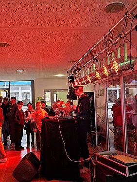Für die perfekte Stimmung sorgte außerdem unser bestens aufgelegtes DJ-Team Laurin, Julian und Frank, das mit viel Einsatz, guter Laune und einer rundum gelungenen Playlist die Aula so richtig zum Beben brachte. Beat für Beat wurde gelacht, getanzt und gefeiert – und für eine Schulstunde lang war der Schulalltag ganz weit weg.